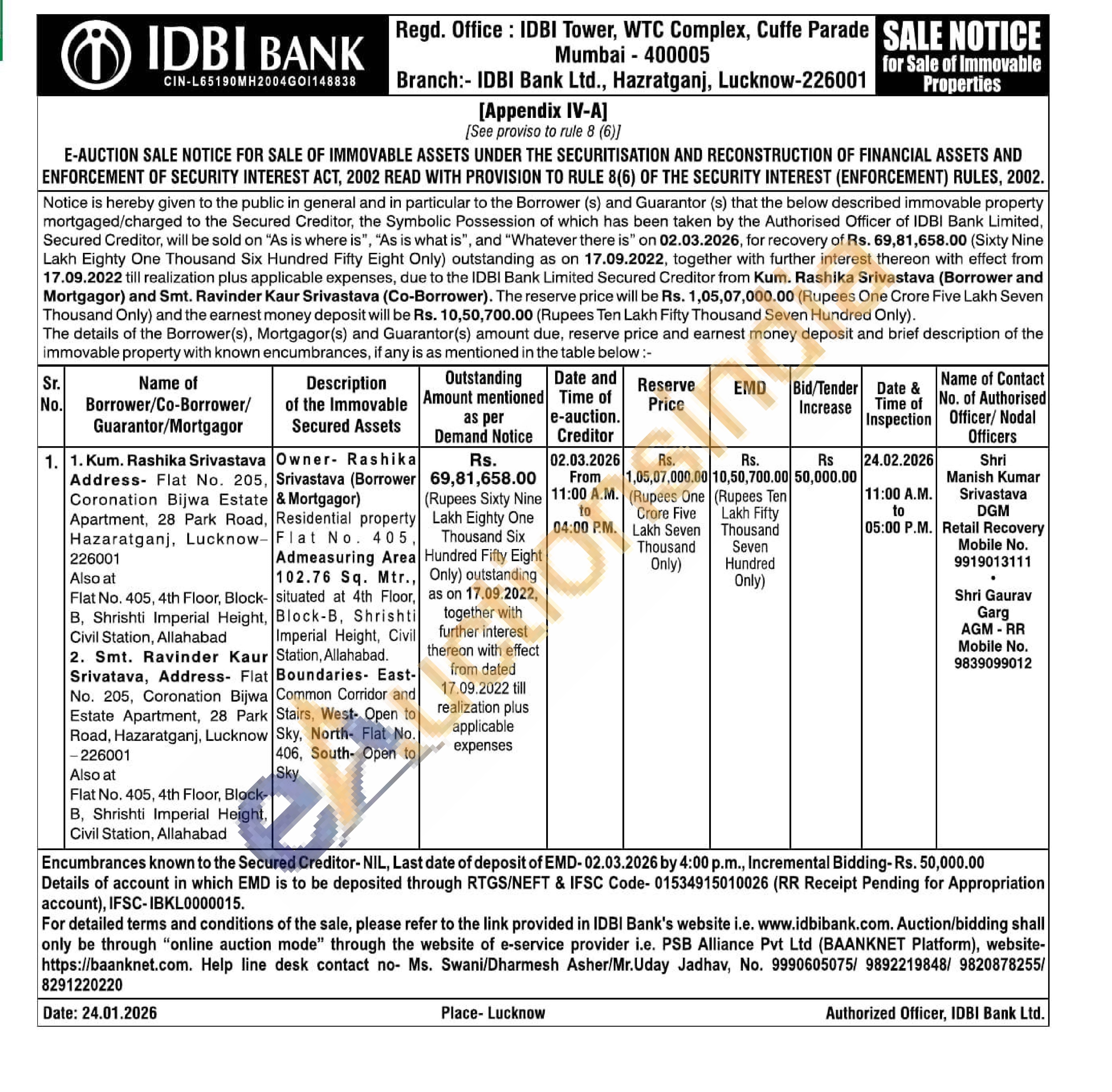 Owner Rashika Srivastava (Borrower & Mortgagor) Residential property Flat No. 405, Admeasuring Area 102.76 Sq. Mtr., situated at 4th Floor, Block-B, Shrishti Imperial Height, Civil Station, Allahabad Boundaries- East-Common Corridor and Stairs, West- Open to Sky, North Flat No. 406, South- Open to Sky