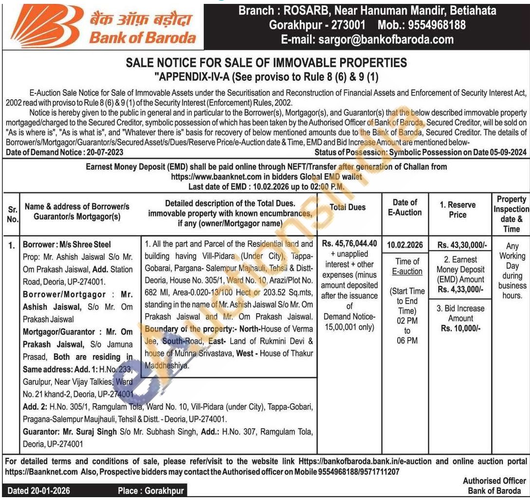 1. All the part and Parcel of the Residential land and building having Vill-Pidara (Under City), Tappa-Gobarai, Pargana-Salempur Majhauli, Tehsil & Distt-Deoria, House No. 305/1, Ward No. 10, Arazi/Plot No. 682 MI, Area-0.020-13/100 Hect or 203.52 Sq.mts, standing in the name of Mr. Ashish Jaiswal S/o Mr. Om Prakash Jaiswal and Mr. Om Prakash Jaiswal. Boundary of the property:- North-House of Verma Jee, South-Road, East Land of Rukmini Devi & house of Munna Srivastava, West - House of Thakur Maddheshiya.