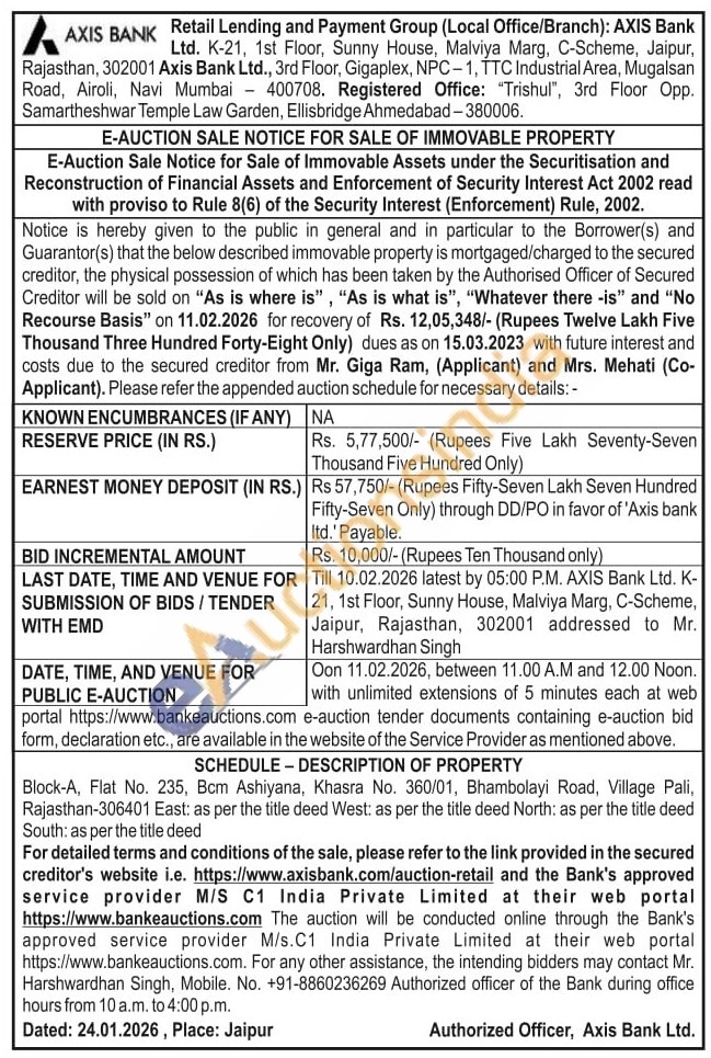 Block-A, Flat No. 235, Bcm Ashiyana, Khasra No. 360/01, Bhambolayi Road, Village Pali, Rajasthan-306401 East: as per the title deed West: as per the title deed North: as per the title deed South: as per the title deed