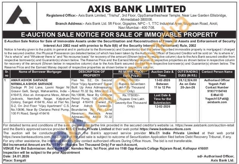 Flat No. S2, On Second Floor "Vijay Apartment Super Built Up Area Admeasuring About 70.32 Sq. Mtrs, At C.s. No.10696, Near By Chetana Petrol Pump, 100 Ft Road, Sangli 416416 Owned By Amar Saravade. Boundaries As Per Land Ashok Revenue Records, Area Admeasuring About 70.32 Sq. Mtrs