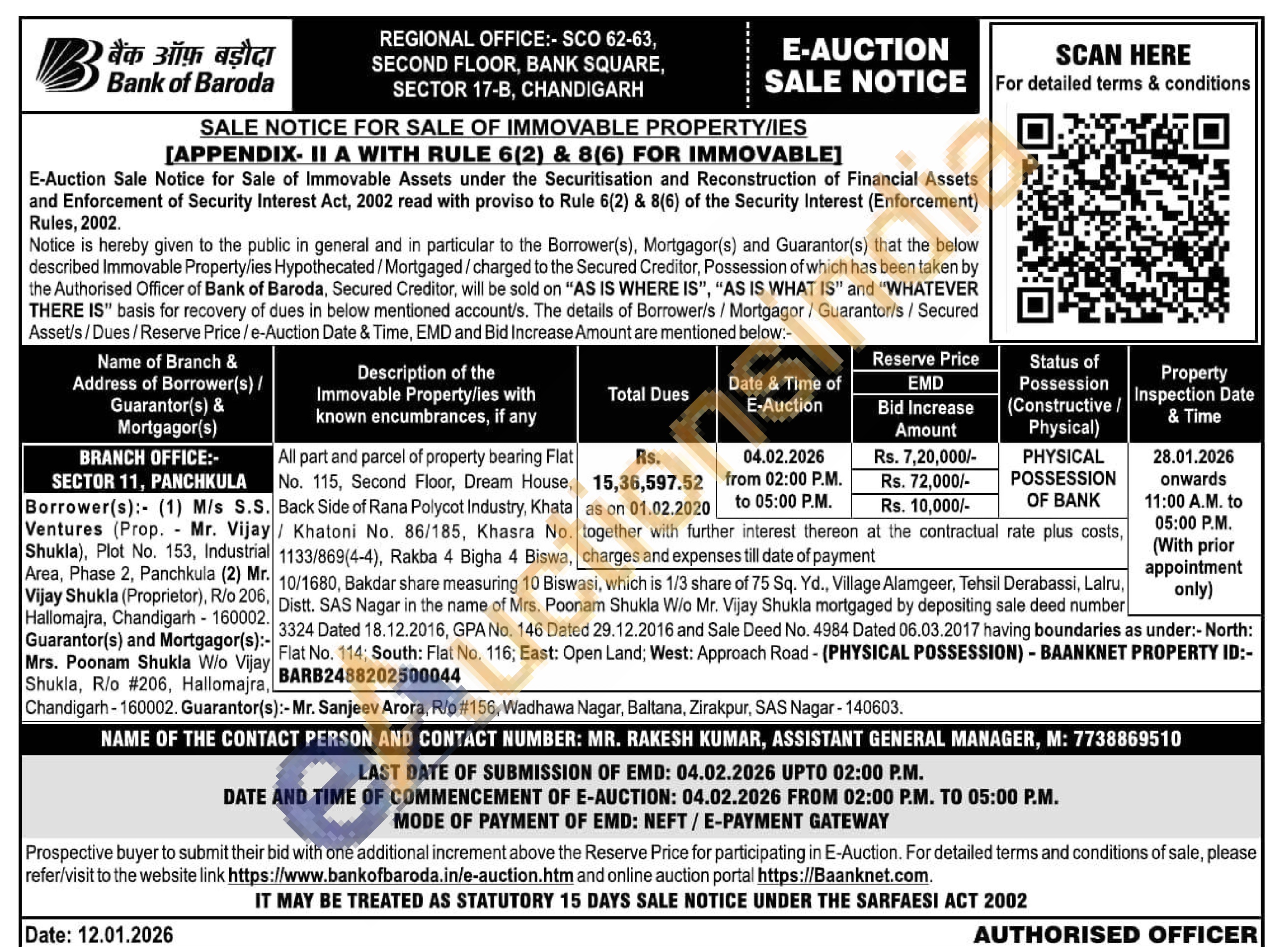 All part and parcel of property bearing Flat No. 115, Second Floor, Dream House, Back Side of Rana Polycot Industry, Khata Khatoni No. 86/185, Khasra No. 1133/869(4-4), Rakba 4 Bigha 4 Biswa,10/1680, Bakdar share measuring 10 Biswasi, which is 1/3 share of 75 Sq. Yd., Village Alamgeer, Tehsil Derabassi, Lalru, Distt. SAS Nagar in the name of Mrs. Poonam Shukla W/o Mr. Vijay Shukla mortgaged by depositing sale deed number 3324 Dated 18.12.2016, GPA No. 146 Dated 29.12.2016 and Sale Deed No. 4984 Dated 06.03.2017 having boundaries as under:- North: Flat No. 114; South: Flat No. 116; East: Open Land; West: Approach Road - (PHYSICAL POSSESSION) - BAANKNET PROPERTY ID:-