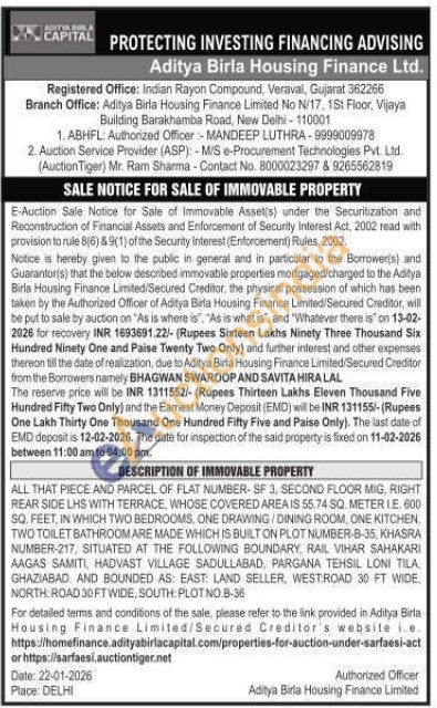 ALL THAT PIECE AND PARCEL OF FLAT NUMBER-SF 3. SECOND FLOOR MIG, RIGHT REAR SIDE LHS WITH TERRACE, WHOSE COVERED AREA IS 55.74 SQ. METERIE. 600 SQ. FEET, IN WHICH TWO BEDROOMS, ONE DRAWING DINING ROOM, ONE KITCHEN. TWO TOILET BATHROOM ARE MADE WHICH IS BUILT ON PLOT NUMBER-B-35, KHASRA NUMBER-217, SITUATED AT THE FOLLOWING BOUNDARY, RAIL VIHAR SAHAKARI AAGAS SAMITI, HADVAST VILLAGE SADULLABAD, PARGANA TEHSIL LONI TILA GHAZIABAD AND BOUNDED AS: EAST: LAND SELLER, WEST ROAD 30 FT WIDE NORTH ROAD 30 FT WIDE, SOUTH: PLOTNO B-36