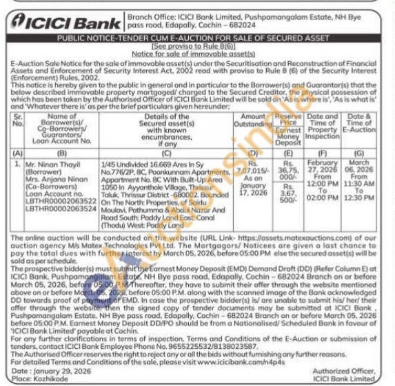 1/45 Undivided 16.669 Ares in Sy No.776/2P, BC Poonkunnam Apartments, Appartment No. BC With Built-Up Area 1050 in Ayyanthole Village, Thrissur Taluk, Thrissur District-680002. Bounded On The North: Properties, of Saidu Moulavi, Pathumma & Abdul Nazar And Road South: Paddy Land East: Conal (Thodu) West: Paddy Land
