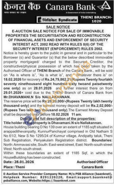 Details and full description of the properties: Title holder of the property is Dhavamani.N s/o Nallakannan : House building bearing D No 139 over an extent of 1185 sqft situated in arappadithevanpatty, KunnurPanchayat comprised in Old Natham S No 61/2, New S.No 1295/24 of Kunnur village, Andipatty taluk, Theni Sub Registration, Periyakulam Registration district. Boundaries: North: Ammavasi site, South: East-west street, East: North-south street West: North-south street.