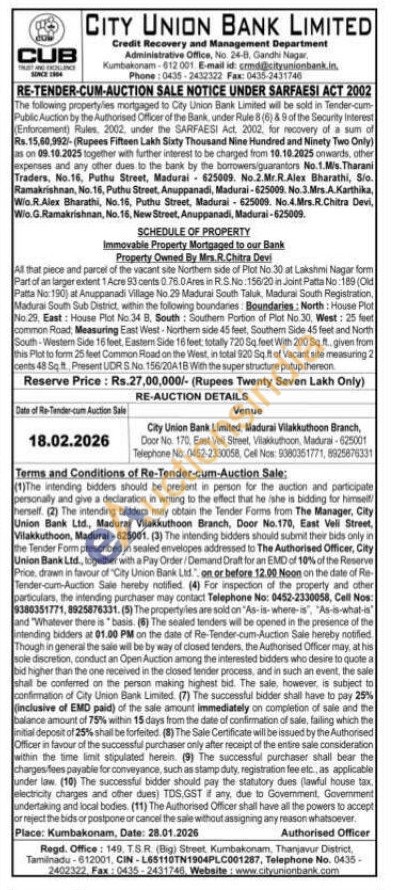 All that piece and parcel of the vacant site Northern side of Plot No.30 at Lakshmi Nagar form Part of an larger extent 1 Acre 93 cents 0.76.0 Ares in RS.No:156/20 in Joint Patta No:189 (Old Patta No:190) at Anuppanadi Village No. 29 Madurai South Taluk, Madurai South Registration, Madurai South Sub District, within the following boundaries: Boundaries: North: House Plot No 29. East: House Plot No.34 B. South Southern Portion of Plot No. 30. West: 25 feet common Road, Measuring East West-Northern side 45 feet, Southem Side 45 feet and North South-Western Side 16 feet, Eastern Side 16 feet totally 720 Sq feet With 200 Sqft given from this Plot to form 25 feet Cominion Road on the West, in total 920 Sq. ft of Vacant site measuring 2 cents 48 Soft Present UDRS No. 156/20A1B With the super structure putup thereon.