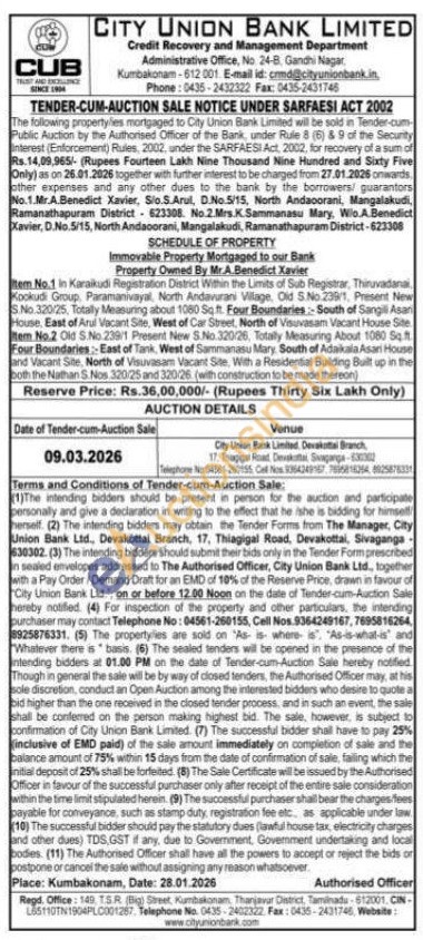Item No.1 in Karaikudi Registration District Within the Limits of Sub Registrar, Thiruvadanai. Kookudi Group, Paramanivayal, North Andavurani Village, Old 5.No.239/1, Present New S No.320/25, Totally Measuring about 1080 Sqft. Four Boundaries: South of Sangill Asari House, East of Arul Vacant Site, West of Car Street, North of Visuvasam Vacant House Site tem No.2 Old S. No. 239/1 Present New S.No.320:26. Totally Measuring About 1080 Sq.ft. Four Boundaries: East of Tank, West of Sammanasu Mary, South of Adakala Asari House and Vacant Site, North of Visuvasam Vacant Site. With a Residential Building Built up in the both the Nathan S Nos 320/25 and 320/26 (with construction h construction to be made thereon)