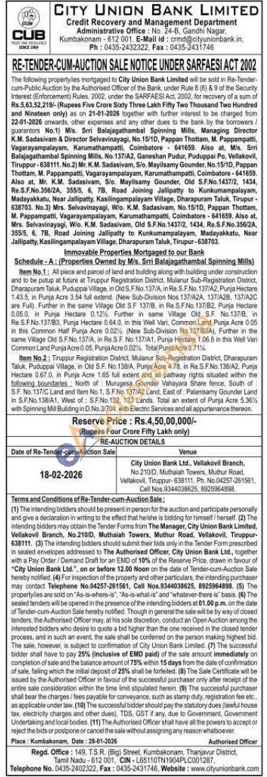 Item No.1: All piece and parcel of land and building along with building under construction and to be putup at future at Tiruppur Registration District, Mulanur Sub-Registration District, Dharapuram Taluk, Puduppai Village, in Old S.F.No. 137/A, in Re.S.F.No. 137/A2, Punja Hectare 1.43.5, in Punja Acre 3.54 full extend. (New Sub-Division Nos. 137/A2A, 137/A28, 137/A2C are Full). Further in the same Village Old S.F 137/B, in Re.S.F.No. 137/82, Punja Hectare 0.05.0, in Punja Hectare 0.12%. Further in same Vilage Old S.F. No.137/B, in Re.S.F.No. 137/B3, Punja Hectare 0.64.0, in this Well Vari, Common Land Punja Acre 0.05 in this Common Half Punja Acre 0.02 1/2 (New Sub-Division No.137/B3A), Further in the same Village Old S.F.No. 137/A, in Re.S.F. No. 137/A1, Punja Hectare 1.06.5 in this Well Vari Common Land Punja Acre 0.05, Punja Acre 0.02 1/2. Total Punja Acre 3.71 1/2