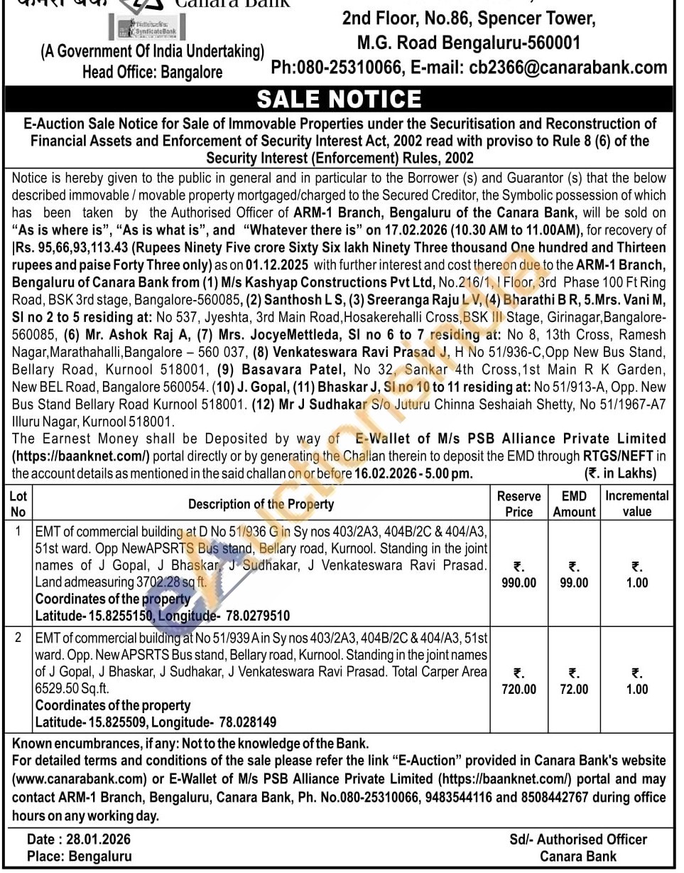 EMT of commercial building at No 51/939 A in Sy nos 403/2A3, 404B/2C & 404/A3, 51st ward. Opp. New APSRTS Bus stand, Bellary road, Kurnool. Standing in the joint names of J Gopal, J Bhaskar, J Sudhakar, J Venkateswara Ravi Prasad. Total Carper Area 6529.50 Sq.ft.
