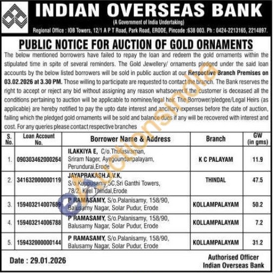 Indian Overseas Bank Gold Auctions Auction in Erode