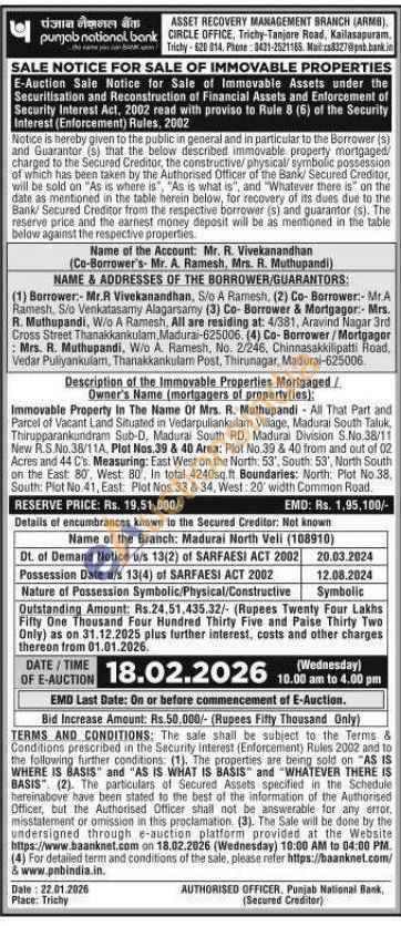 Immovable Property In The Name Of Mrs. R. Muthupandi All That Part and Parcel of Vacant Land Situated in Vedarpuliankulam Village, Madurai South Taluk, Thirupparankundram Sub-D, Madurai South RD, Madurai Division S.No.38/11 New R.S.No.38/11A, Plot Nos.39 & 40 Area: Plot No.39 & 40 from and out of 02 Acres and 44 C's. Measuring: East West on the North: 53', South: 53', North South on the East: 80, West: BO, In total 4240sq.ft Boundaries: North: Plot No.38, South: Plot No.41, East: Plot Nos.33 & 34, West: 20' width Common Road.