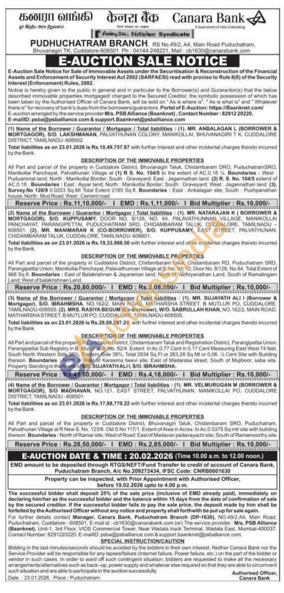 1) All Part and parcel of the property in Cuddalore District, Bhuvanagii Taluk, Chidambaram DRO, PuduchatramSRO, Manikollai Panchayat, Palvathunan Village at (1) R S. No. 104/5 to the extent of AC.0.18% Boundaries: West: Puduammal land, North: Manikollai Border, South Graveyard, East: Jegannathan land. (2) R. S. No. 104/5 extend of AC.0.18, Boundaries: East: Ayyar land, North Manikollai Border, South Graveyard, West Jagannathan land. (3). Survey.No 128/9 0.0203 Sq. Mt. Total Extent 2185 Sq.ft. Boundaries: East: Anbalagan site, South Pushpanathan house, North Mud Fload: West: Cement road.