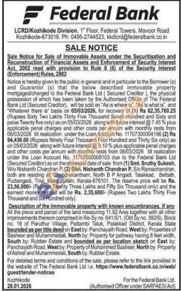 Description of the immovable property with known encumbrances, if any All the piece and parcel of the land measuring 11.92 Ares together with all other improvements thereon comprised in Re-Sy no. 641/5/1, (Old Sy no. 392/6), Block no. 18 of Paruthur Village, Pattambi Taluk, Palakkad District, Kerala State bounded as per title deed on East by: Panchayath Road, West by: Properties of Basheer and Muhammedali, North by: Property for pathway having 8 feet width, South by: Rubber Estate and bounded as per location sketch on East by: Panchayath Road, West by: Property of Muhammed Basheer, North by: Property of Ashraf and Muhammedali, South by: Rubber Estate