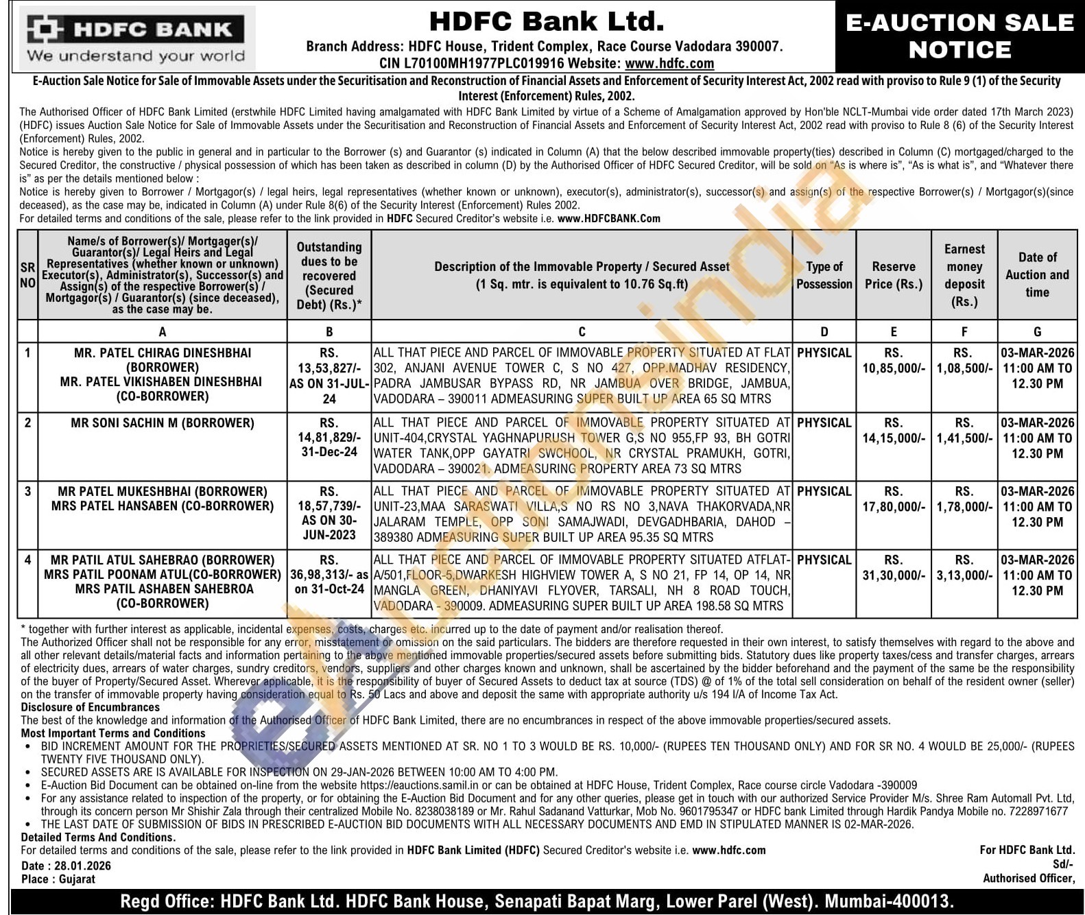 ALL THAT PIECE AND PARCEL OF IMMOVABLE PROPERTY SITUATED ATFLAT-A/501, FLOOR-5,DWARKESH HIGHVIEW TOWER A, S NO 21, FP 14, OP 14, NR MANGLA GREEN, DHANIYAVI FLYOVER, TARSALI, NH 8 ROAD TOUCH, VADODARA-390009. ADMEASURING SUPER BUILT UP AREA 198.58 SQ MTRS