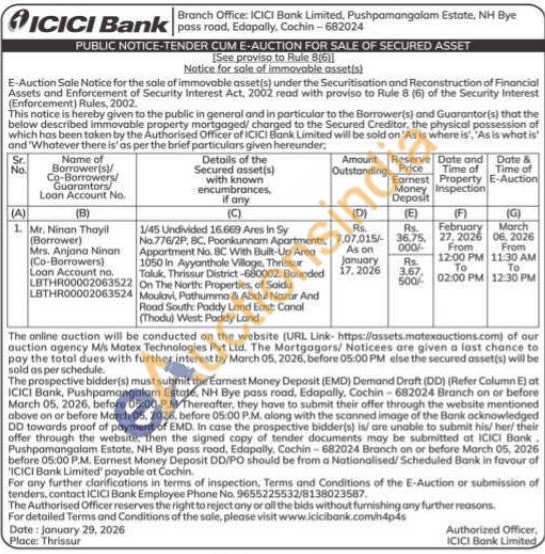 1/45 Undivided 16.669 Ares In Sy No.776/2P, BC, Poonkunnam Apartments, Appartment No. BC With Built-Up Area 1050 In Ayyanthole Village, Thrissur Taluk, Thrissur District-680002. Bounded On The North: Properties, of Saidu Moulovi, Pathumma & Abdul Nazar And Road South: Paddy Land East: Canal (Thodu) West: Paddy Land