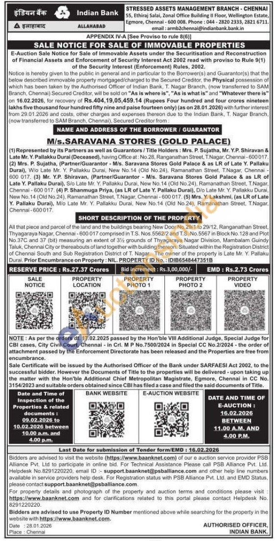 All that piece and parcel of the land and the buildings bearing New Door No. 29/1 to 29/12, Ranganathan Street. Thyagaraya Nagar, Chennai-600017 comprised in T.S. Nos 5562/2 and T.S. No. 5567 in Block No. 128 and Piot No.37C and 37 (bit) measuring an extent of 3 1/2 grounds of Thyagaraya Nagar Division, Mambalam Guindy Taluk, Chennai City or thereabouts of land together with building thereon. Situated within the Registration District of Chennai South and Sub Registration District of T. Nagar. The owner of the property is Late Mr. Y. Pallaku Durai. Prior Encumbrance on Property: NIL. PROPERTY ID No.: IDIB65484473518