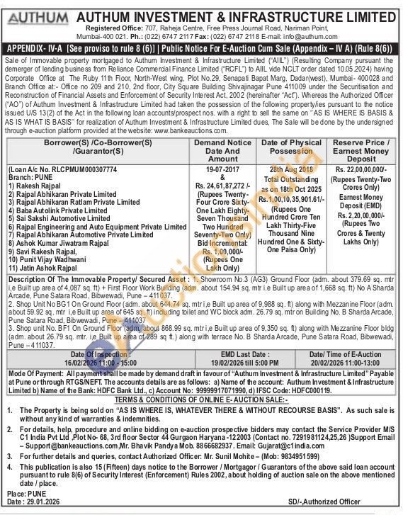 Le Built up area of 4,087 sq. ft) + First Floor Work Building (adm. about 154.94 sq. mtr ie Built up area of 1,668 sq. ft) No A Sharda Arcade, Pune Satara Road, Bibwewadi, Pune 411037. 2. Shop Unit No BG1 On Ground Floor (adm. about 644.74 sq. mtrie Built up area of 9,988 sq. ft) along with Mezzanine Floor (adm. about 59.92 sq. mtr i,e Built up area of 645 sq. ft) including toilet and WC block adm. 26.79 sq. mtr on Building No. B Sharda Arcade, Pune Satara Road, Bibwewadi, Pune 411037 3. Shop unit No. BF1 On Ground Floor (adm. about 868.99 sq. mtri,e Built up area of 9,350 sq. ft) along with Mezzanine Floor bldg (adm. about 26.79 sq. mtr. ie Built up area of 289 sq ft.) along with terrace No. B Sharda Arcade, Pune Satara Road, Bibwewadi, Pune 411037