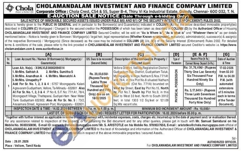 Mr. Samuel Samidurai : 9500350890, E-mail ID :samuels@chola.murugappa.com/Mr. S. ARISTOTLE : 9789537656, E-mail: aristotles@chola.murugappa.com