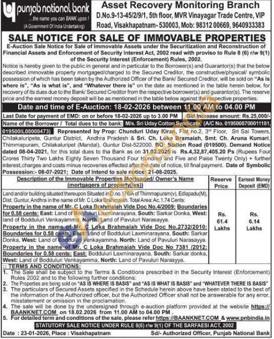 Land and/or building situated thereupon Situated in D.no. 176/A of Thimmapuram(v), Edlapadu(M), Dist. Guntur, Andhra in the name of Mr. C Loka Brahmaiah. Total Area: Ac. 1.74 Cents: Property in the name of Mr. C Loka Brahmaiah Vide Doc No.4/2009: Boundaries for 0.58 cents: East: Land of Bodduluri Laxminarayana, South: Sarkar Donka, West: land of Bodduluri Venkayamma, North: Land of Pavuluri Narasayya,