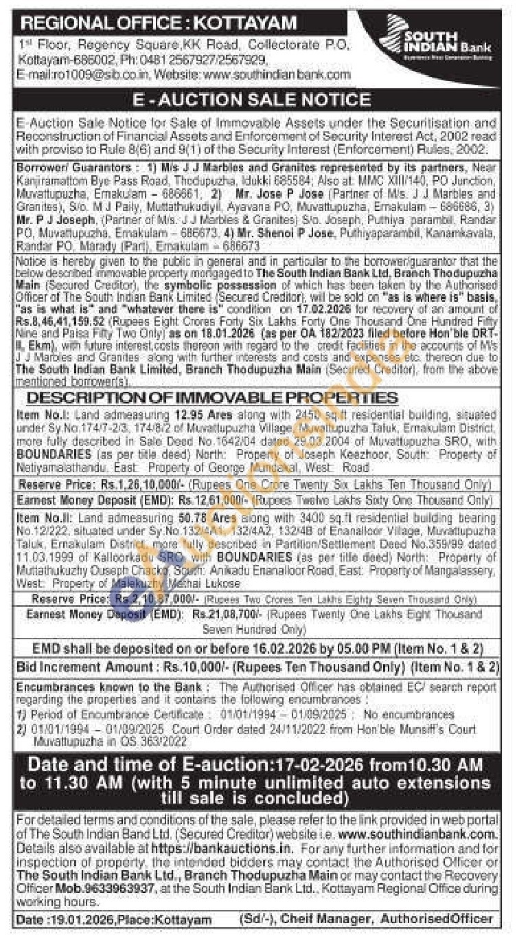 Item No.II: Land admeasuring 50.78 Ares along with 3400 sq.ft residential building bearing No. 12222. situated under Sy No 1324A1, 1324A2, 1324B of Enanalloor Vilage, Muvattupuzha Taluk, Ernakulam District more fully described in Partition/Settlement Deed No.35999 dated 11.03.1999 of Kalloorkadu SRO, with BOUNDARIES as per title deed North: Property of 11.03.1999 of Kalloorkadu SRO, with BOUNDARIES as per title deed North: Property of West: Property of Malekuzhy Mathai Lukose