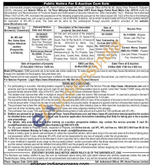 All that part and parcel of the property bearing Plot No. D-07, Of Sector-D& South, Part Of Plot No.8-74, Of Sector-B Kh.No. 5461/329 & Mer Panchsheel Nagar Vistar. Nagaur. Merta City Rajasthan India 341510 Area Admeasuring (In Sq. PL.): Property Type: Land Area. Carpet Area, BultUp Ares Property Area: 1000.00, 550.00, 655.00