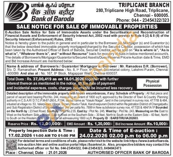 Detailed description of the immovable property with known encumbrances, if any: Schedule of Property: All that piece and parcel of vacant land bearing Plot No. 244, measuring an extent of 1800 sq.ft, approved by the Director of Town & Country Planning authonty in C.S.A.R/ D.T.C.P.M-87-260/L.P. 194, layout name as "Vasuki Nagar", land in the comprised in survey nos. 477/18 & 484. situated at village no. 53, Valarpuram Village, Sriperumbudur Taluk, Kancheepuram District within Registration District of Chengalpattu and Sub Registration District of Sriperumbudur. (As per patta No. 7899 in New subdivision survey nos. 477/20 & 484/1A 1F Bounded on the North by: 23 feet Road, South by: Plot No.235, East by: Plot No. 245, West by: Plot No. 243. Measuring on the East to West on the Northern Side-30 feet, East to West on the Southern Side-30 feet, North to South on the Eastern Side-60 feet, North to South on the Western Side-60 feet, In all admeasuring 1800 sq.ft. Property ID: BARBTIRUVA202603.