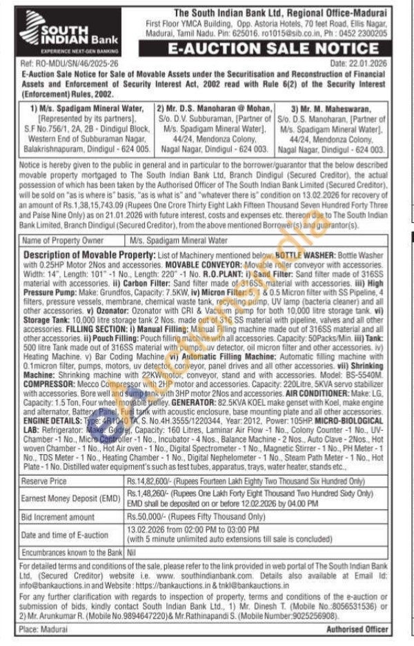 Description of Movable Property: List of Machinery mentioned below: BOTTLE WASHER: Bottle Washer with 0.25HP Motor 2Nos and accessories. MOVABLE CONVEYOR: Movable roller conveyor with accessories. Width: 14, Length: 101 -1 No., Length: 220 -1 No. R.O.PLANT: i Sand Filter: Sand filter made of 316SS material with accessories, ii Carbon Filter: Sand filter made of 316SS material with accessories. iii High Pressure Pump: Make: Grundfos, Capacity: 7.5KW, iv Micron Filter: 5,1 0.5 Micron filter with SS Pipeline, 4 filters, pressure vessels, membrane, chemical waste tank, recycling pump, UV lamp bacteria cleaner and all other accessories. v Ozonator: Ozonator with CRI Vacuum pump for both 10,000 litre storage tank. vi Storage Tank: 10,000 litre storage tank 2 Nos, made out of 316 SS material with pipeline, valves and all other accessories. Note: Full Description will be available in the Sale Notice.