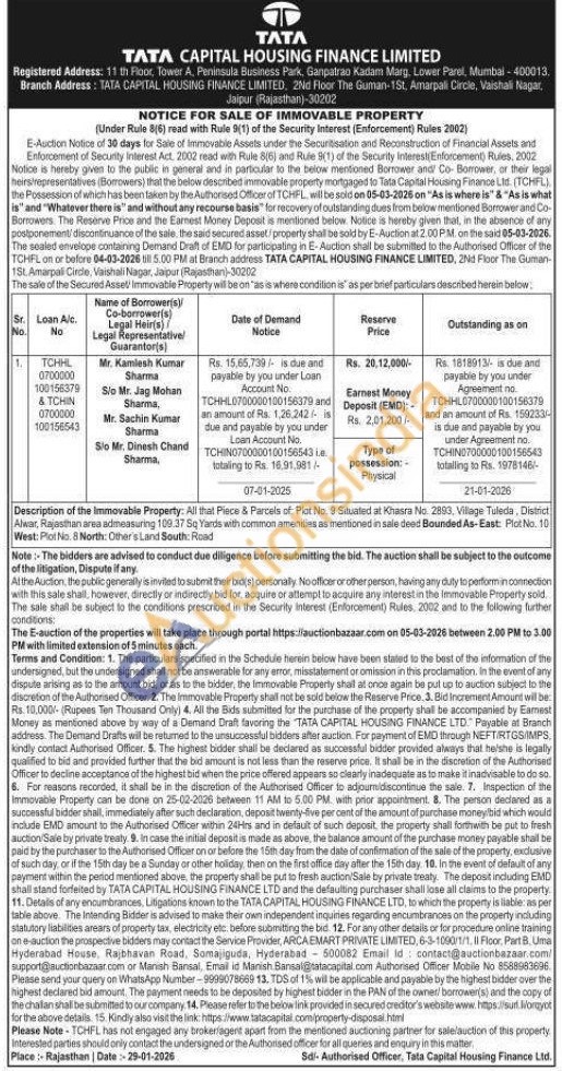 Description of the Immovable Property: All that Piece & Parcels of: Plot No. 9 Situated at Khasra No. 2893, Village Tuleda, District Alwar, Rajasthan area admeasuring 109.37 Sq Yards with common amenities as mentioned in sale deed Bounded As-East: Plot No. 10 West: Plot No. 8 North: Other's Land South: Road