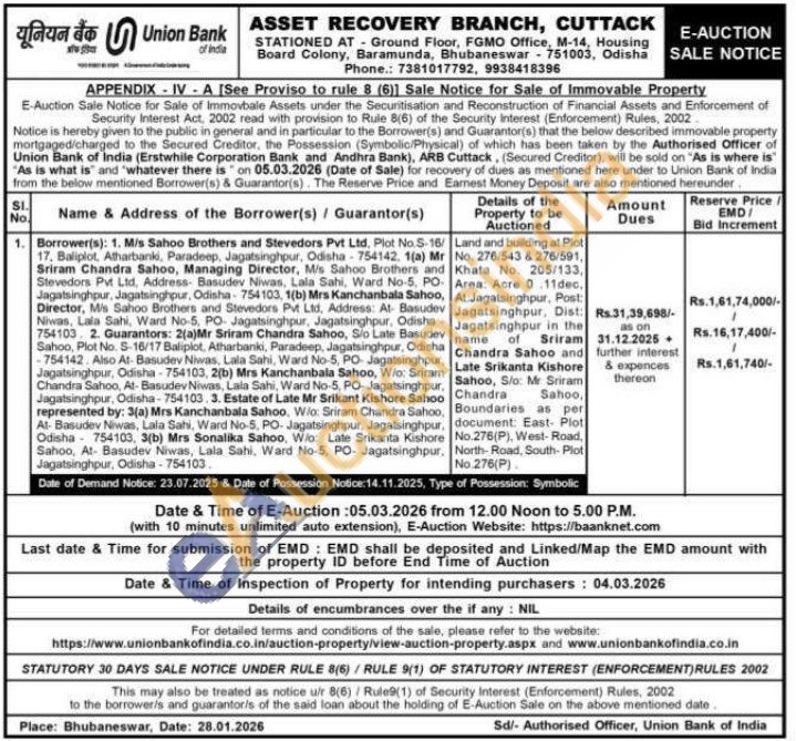 Land and building at Plot No. 276/543 & 276/591, Khata No. 205/133, Area: Acre 0.11dec. At:Jagatsinghpur, Post: Jagatsinghpur, Dist:Jagatsinghpur in the name of Sriram Chandra Sahoo and Late Srikanta Kishore Sahoo, Slo: Me Sriram Chandra Sahoo, Boundaries as per document: East- Plot No.276(P), West-Road, North-Road, South- Plot No.276(P)