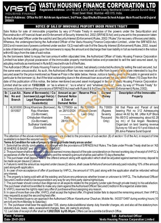 All that Piece and Parcel of land bearing Plot no 312 Admeasuring about 44.62 Sq Mt. (After KJP Block No 85/312 admeasuring about 62.29 sq mt) of Sai Angan Residency Organized on land bearing revenue Survey no 100 and 101 and it block no 85 Jolva Paisana Surat Gujarat