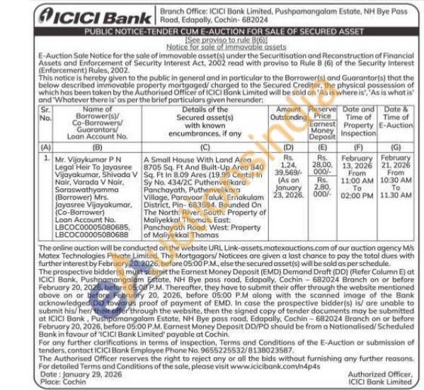 A Small House With Land Area 8705 Sq. Ft And Built-Up Area 840 Sq. Ft in 8.09 Ares (19.99 Cents) In Sy No. 434/2C Puthenvelikara Panchayath, Puthenvelikara Village, Paravoor Taluk, Ernakulam District, Pin-683594. Bounded On The North: River, South: Property of Maliyekkal Thomas, East: Panchayath Rood, West: Property of Maliyekkal Thomas