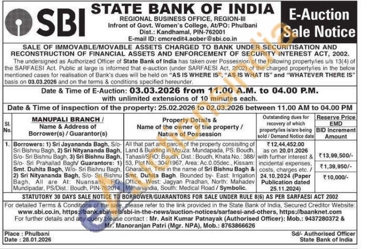 All that part and parcel of the property consisitng of Land & Building in Mouza: Mundapada, PS: Boudh, Tahasil/SRO: Boudh, Dist.: Boudh, Khata No.: 388/53, Plot No.: 304/1967, Area: Ac. 0.05dec., Kissam Gharabari, Title in the name of Sri Bishnu Bagh & Smt. Duhita Bagh. Bounded by East: Irrigation Office, West: Jagyan Pradhan, North: Mahadev Mahanandia, South: Medical Road/Symbolic