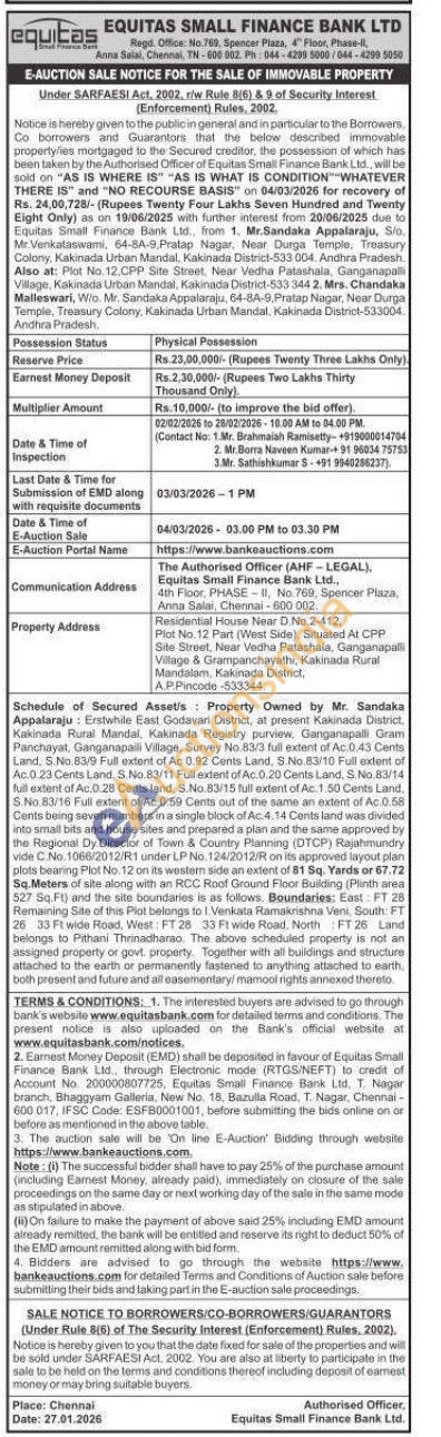 Schedule of Secured Assetis Property Owned by Mr. Sandaka Appalaraju: Erstwhile East Godavari District, at present Kalkonella District, Kakinada Rural Mandel Kakinada Registry purview Danganapalli Gram Panchayat, Ganganapaili Village, Survey No 83/3 full extent of Ac: 0.43 Canta Land. S.No. 13/9 Full extant of Ac 0.92 Cents Land. S No. 83/10 Full sextent of Ac.D.23 Cents Lant S.No 83/11 Full extent of Ac.0.20 Cents Land. S.No.83/14 full extent of Ac 0.28 Cents land. 5.No.83/15 full extent of Ac 1.50 Cents Land. S.No.83:16 Full extent of Ac 0.50 Cenm out of the same an extent of Ac 0.58 Cents being seven numbers ina single block of Ac.4.14 Cents land was divided into smail bits and house sites and prepared a plan and the same approved by the Regional Dy Director of Toen & Country Planning (DTCP) Rajahmundry wide C No. 1066/2012/R1 under LP No. 124/2012 R on its approved layout plan plots bearing Pit No 12 on its wastem side on sont of 81 50. Yards or 67.72 Sq. Meters of site along with an RCC Roof Ground Floor Building (Plinthawa 527 Sq. Ft) and the site boundaries is as follows Boundaries: East FT 28 Remaining Site of this Plat belongs to i Venkata Ramakrishna Veni, South FT 26 33 Ft wide Hood, West: FT 28 33 F1 wide Road. North FT 26 Land belongs to Pithani Thonadharao. The above scheduled property is not an assigned property or govt property Together with all buildings and structure attached to the earth or permanentty fastened to anything attached to earth, both present and future and all saasmentary mamool rights annexed theredo