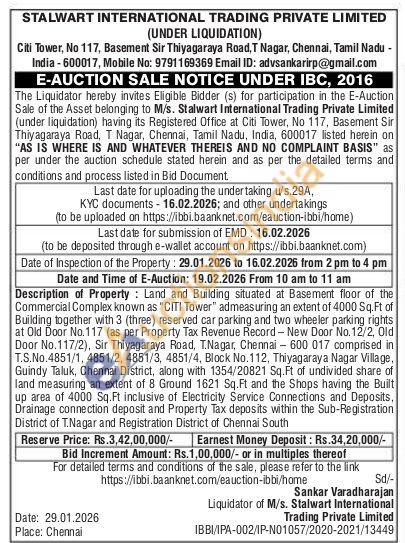 Land and Building situated at Basement floor of the Commercial Complex known as "CITI Tower" admeasuring an extent of 4000 Sq.Ft of Building together with 3 (three) reserved car parking and two wheeler parking rights at Old Door No.117 (as per Property Tax Revenue Record-New Door No.12/2, Old Door No.117/2), Sir Thiyagaraya Road, T.Nagar, Chennai-600 017 comprised in T.S.No.4851/1, 4851/2, 4851/3, 4851/4, Block No. 112, Thiyagaraya Nagar Village. Guindy Taluk, Chennai District, along with 1354/20821 Sq.Ft of undivided share of land measuring an extent of 8 Ground 1621 Sq.Ft and the Shops having the Built up area of 4000 Sq. Ft inclusive of Electricity Service Connections and Deposits. Drainage connection deposit and Property Tax deposits within the Sub-Registration District of T.Nagar and Registration District of Chennai South