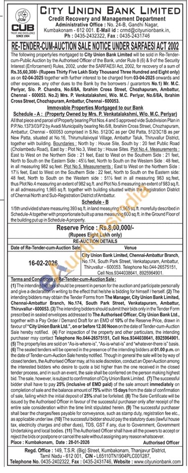 All that piece and parcel of Property bearing Pict Nos.4 and 5 approved vide Subdivision Plan in P.P.No.1373/03/F2 by Avadi Municipality bearing No.6/8, Ibrahim Cross Street, Chozhapuram, Ambattur, Chennai-600053 comprised in S.No. 512/3C as per Old Patta, 512/3C1B as per New Patta, situated at No.16, Thirumullaivoyal Vilage, Ambattur Taluk, Thiruvallur District, together with building. Boundaries: North by House Site, South by: 20 feet Public Road (Cholambedu Road), East by: Plot No.3, West by: House Sites. Plot No.4. Measurementa East to West on the Northern Side: 21 feet, East to West on the Southern Side: 21 feet, North to South on the Eastem Side: 45% feet, North to South on the Western Side: 48 feet, in all measuring 982 sq feet. Plot No.5, Measurements: East to West on the Northern Side: 17% feet, East to West on the Southem Side: 22 feet, North to South on the Eastem side: 48 feet, North to South on the Western side: 51% feet in all measuring 983 sq.feet, thus Plot No.4 measuring an extent of 982 sq.ft. and Plot No.5 measuring an extent of 983 sq.ft. in all admeasuring 1,965 sq.ft. together with building situated within the Registration District of Chennai North and Sub-Registration District of Ambattur.