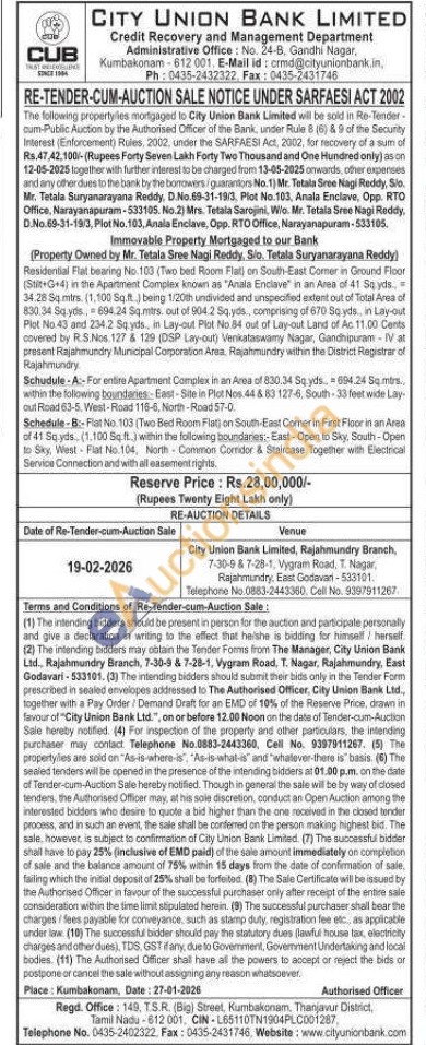 Residential Flat bearing No. 103 (Two bed Room Flat) on South-East Corner in Ground Floor (Stit+G+4) in the Apartment Complex known as "Anala Enclave" in an Area of 41 Sq yds., 34.28 Sq.mtrs. (1,100 Sq.ft.) being 1/20th undivided and unspecified extent out of Total Area of 830.34 Sq.yds., 694.24 Sq.mtrs. out of 904.2 Sq.yds., comprising of 670 Sq yds., in Lay-out Plot No.43 and 234.2 Sq.yds., in Lay-out Plot No.84 out of Lay-out Land of Ac. 11.00 Cents covered by R.S.Nos. 127 & 129 (DSP Lay-out) Venkataswamy Nagar, Gandhipuram - IV at present Rajahmundry Municipal Corporation Area, Rajahmundry within the District Registrar of Rajahmundry Schudule-A-For entire Apartment Complex in an Area of 830.34 Sq.yds., = 694.24 Sq.mtrs., within the following boundaries-East-Site in Plot Nos.44 & 83 127-6, South-33 feet wide Lay-out Road 63-5, West-Road 116-6, North-Road 57-0. Schedule-B:-Flat No.103 (Two Bed Room Flat) on South-East Comer in First Floor in an Area of 41 Sq.yds., (1.100 Sq. ft.) within the following boundaries:-East-Open to Sky, South-Open to Sky, West-Flat No.104, North Common Corridor & Staircase Together with Electrical Service Connection and with all easement rights.
