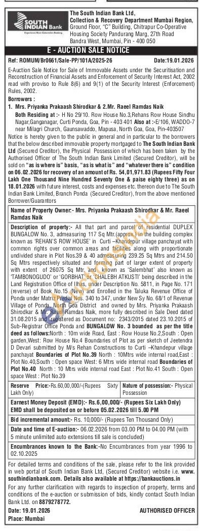 All that part and parcel of residential DUPLEX BUNGALOW No. 3, admeasuring 117 Sq Mtr.approx. in the building complex known as REHANS ROW HOUSE in Curti-Khandepur village panchayat with common rights over common areas and facilities along with proportionate undivided share in Plot Nos.39 40 admeasuring 239.25 Sq Mtrs and 214.50 Sq Mtrs respectively situated and forming part of larger extent of property with extent of 26075 Sq Mtr. and known as Salembhat also known as TAMBONOGUDO or GORBHAT or CHALEBH ATKUSTI being described in the Land Registration Office of Ilhas, under Description No. 5811, in Page No. 171 reverse of Book No.15 New and Enrolled in the Taluka Revenue Office of Ponda under Matriz Predial Nos. 340 to 347, under New Sy No. 681 of Revenue Village of Ponda, North Goa District Note: Full Description will be available in the Sale Notice.