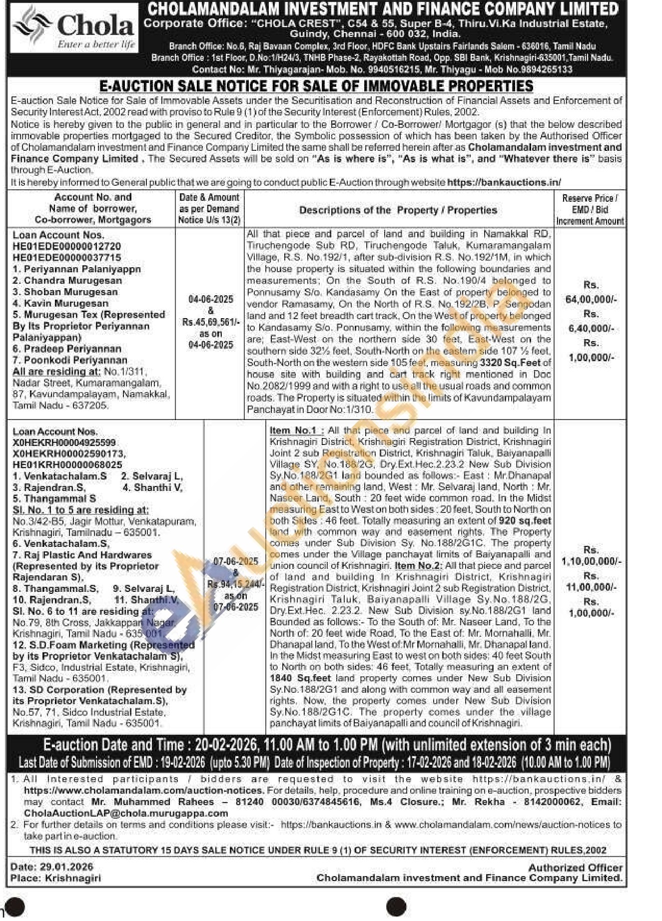 Item No.1: All that piece and parcel of land and building In Krishnagiri District, Krishnagiri Registration District, Krishnagiri Joint 2 sub Registration District, Krishnagiri Taluk, Baiyanapalli Village SY, No. 188/2G, Dry.Ext. Hec.2.23.2 New Sub Division Sy.No. 188/2G1 land bounded as follows:- East: Mr.Dhanapal and other remaining land, West: Mr. Selvaraj land, North: Mr. Naseer Land, South: 20 feet wide common road, in the Midst measuring East to West on both sides: 20 feet, South to North on both Sides: 46 feet. Totally measuring an extent of 920 sq.feet land with common way and easement rights. The Property comes under Sub Division Sy. No. 188/2G1C. The property comes under the Village panchayat limits of Baiyanapalli and union council of Krishnagin. Item No.2: All that piece and parcel of land and building In Krishnagiri District, Krishnagiri - Registration District, Krishnagiri Joint 2 sub Registration District, Krishnagiri Taluk, Baiyanapalli Village Sy. No. 188/2G, Dry Ext Hec. 2.23.2 New Sub Division sy. No. 188/2G1 land Bounded as follows:- To the South of: Mr. Naseer Land, To the North of: 20 feet wide Road, To the East of: Mr. Mornahalli, Mr. Dhanapal land, To the West of: Mr Mornahalli, Mr. Dhanapal land. In the Midst measuring East to west on both sides: 40 feet South to North on both sides: 46 feet, Totally measuring an extent of 1840 Sq.feet land property comes under New Sub Division Sy.No.188/261 and along with common way and all easement rights. Now, the property comes under New Sub Division Sy. No. 188/2G1C. The property comes under the village panchayat limits of Baiyanapalli and council of Krishnagiri