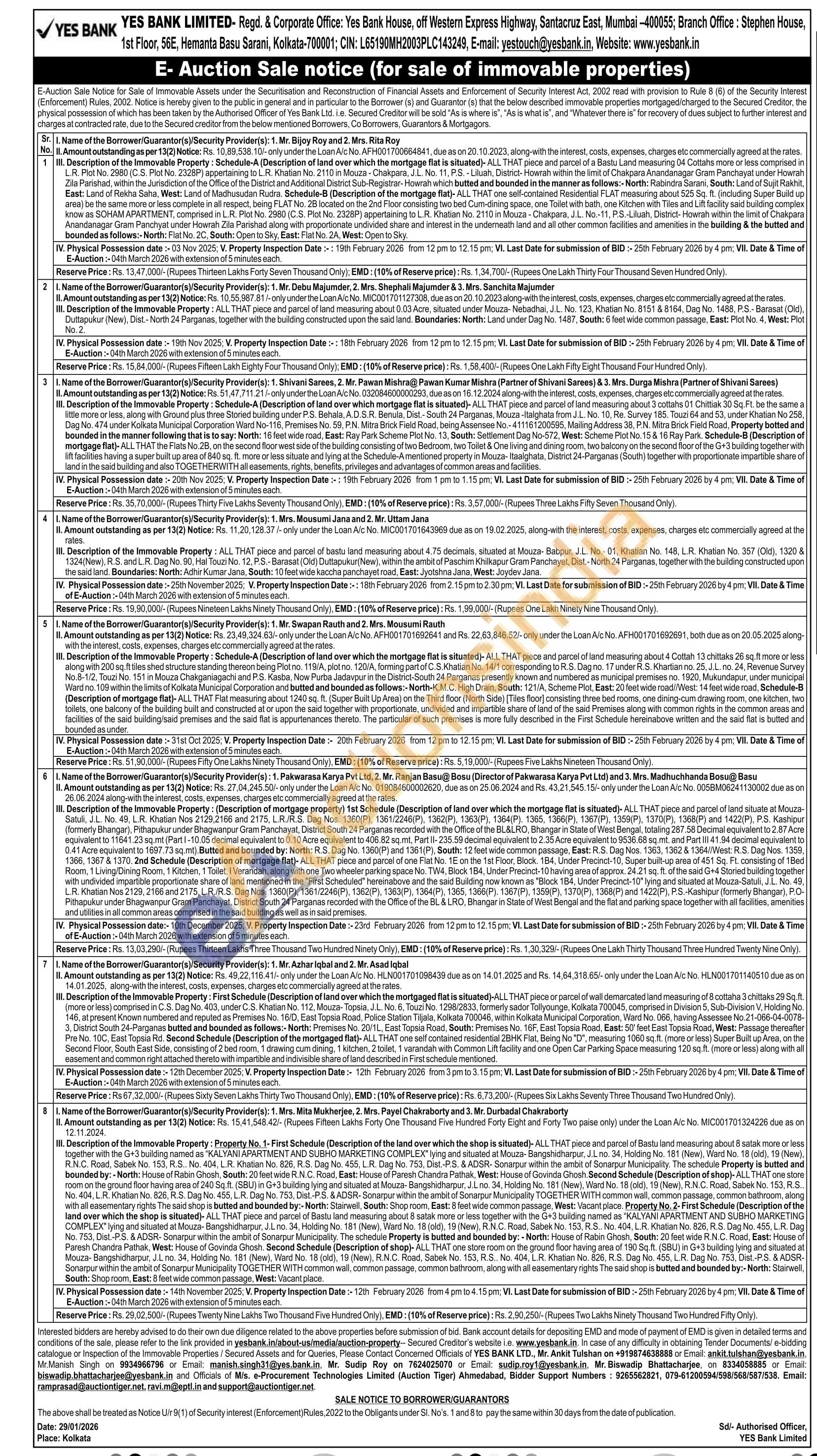 8) ALL THAT piece and parcel of Bastu land measuring about 8 satak more or less together with the G+3 building named as "KALYANI APARTMENT AND SUBHO MARKETING COMPLEX" lying and situated at Mouza-Bangshidharpur, J.L no. 34, Holding No. 181 (New), Ward No. 18 (old), 19 (New), R.N.C. Road, Sabek No. 153, R.S.. No. 404, L.R. Khatian No. 826, R.S. Dag No. 455, L.R. Dag No. 753, Dist.-P.S. & ADSR-Sonarpur within the ambit of Sonarpur Municipality. The schedule Property is butted and bounded by:-North: House of Rabin Ghosh, South: 20 feet wide R.N.C. Road, East: House of Paresh Chandra Pathak, West: House of Govinda Ghosh. Second Schedule (Description of shop)-ALL THAT one store room on the ground floor having area of 240 Sq.ft. (SBU) in G+3 building lying and situated at Mouza-Bangshidharpur, J.L no. 34, Holding No. 181 (New), Ward No. 18 (old), 19 (New), R.N.C. Road, Sabek No. 153, R.S.. No. 404, L.R. Khatian No. 826, R.S. Dag No. 455, L.R. Dag No. 753, Dist.-P.S. & ADSR- Sonarpur within the ambit of Sonarpur Municipality TOGETHER WITH common wall, common passage, common bathroom, along with all easementary rights The said shop is butted and bounded by:-North: Stairwell, South: Shop room, East: 8 feet wide common passage, West: Vacant place. Property No. 2- First Schedule (Description of the land over which the shop is situated)- ALL THAT piece and parcel of Bastu land measuring about 8 satak more or less together with the G+3 building named as "KALYANI APARTMENT AND SUBHO MARKETING COMPLEX" lying and situated at Mouza-Bangshidharpur, J.L no. 34, Holding No. 181 (New), Ward No. 18 (old), 19 (New), R.N.C. Road, Sabek No. 153, R.S.. No. 404, L.R. Khatian No. 826, R.S. Dag No. 455, L.R. Dag No. 753, Dist.-P.S. & ADSR- Sonarpur within the ambit of Sonarpur Municipality. The schedule Property is butted and bounded by: North: House of Rabin Ghosh, South: 20 feet wide R.N.C. Road, East: House of Paresh Chandra Pathak, West: House of Govinda Ghosh. Second Schedule (Description of shop)- ALL THAT one store room on the ground floor having area of 190 Sq.ft. (SBU) in G+3 building lying and situated at Mouza-Bangshidharpur, J.L no. 34, Holding No. 181 (New), Ward No. 18 (old), 19 (New), R.N.C. Road, Sabek No. 153, R.S.. No. 404, L.R. Khatian No. 826, R.S. Dag No. 455, L.R. Dag No. 753, Dist.-P.S. & ADSR-Sonarpur within the ambit of Sonarpur Municipality TOGETHER WITH common wall, common passage, common bathroom, along with all easementary rights The said shop is butted and bounded by:-North: Stairwell, South: Shop room, East: 8 feet wide common passage, West: Vacant place.