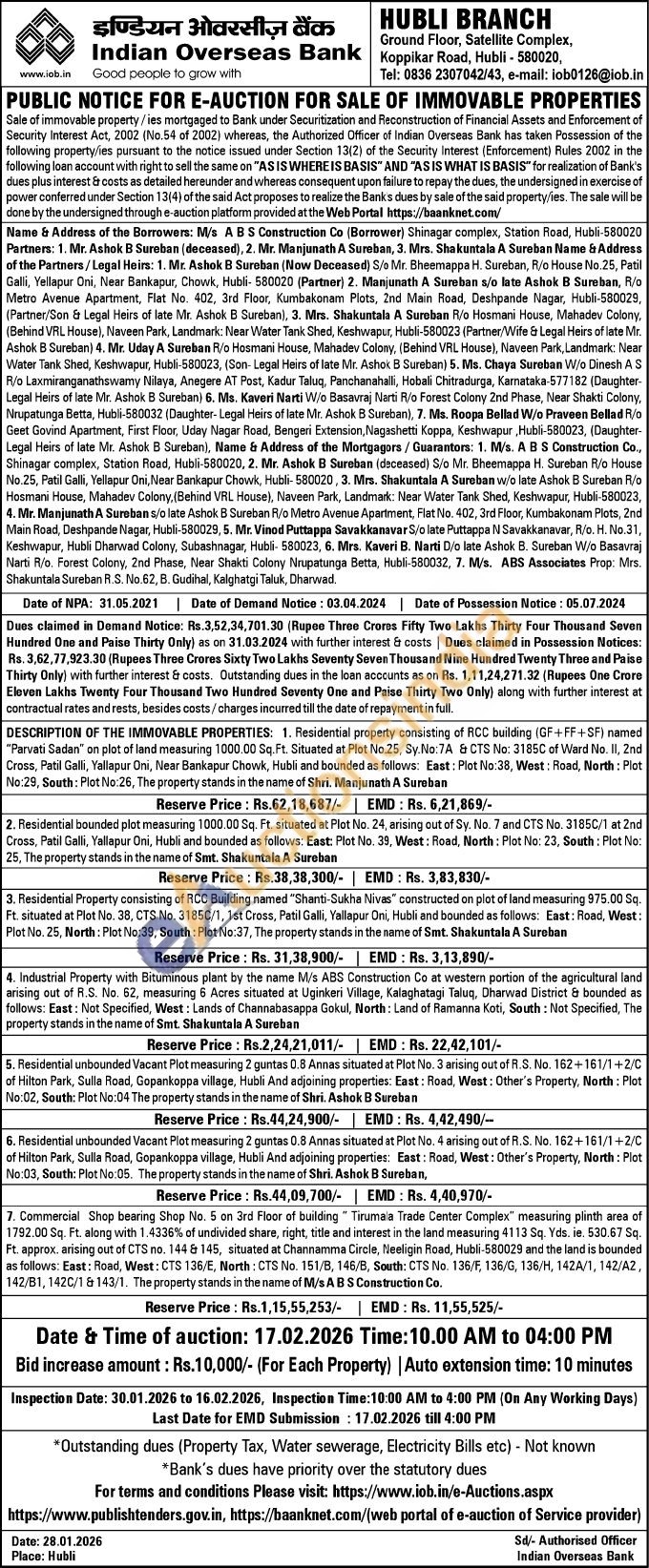 1. Residential property consisting of RCC building (GF+FF+SF) named "Parvati Sadan" on plot of land measuring 1000.00 Sq.Ft. Situated at Plot No.25, Sy.No:7A & CTS No: 3185C of Ward No. II, 2nd Cross, Patil Galli, Yallapur Oni, Near Bankapur Chowk, Hubli and bounded as follows: East: Plot No:38, West: Road, North: Plot No:29, South: Plot No:26, The property stands in the name of Shri. Manjunath A Sureban