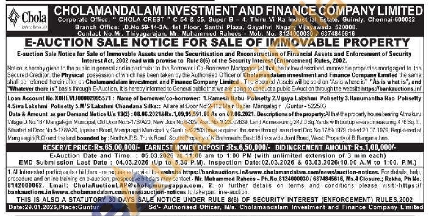Descriptions of the property: All that the property house bearing Almakuru Village D. No. 167 Mangalagiri Municipal, Old Door No.5-17S/A20, New Door No 6-329, Asst. No. 1023002639, Land Admeasuring 242.10 Sq. Yards with buitup area admeasuring 476 Sq. ft., Situated at Door No.5-178/A20, Ippatam Road, Mangalagiri Municipality, Guntur-522503 have acquired the same through sale dead Doc. No. 1789/1979 dated 20.07.1979, Registered at Mangalagiri(RO) and the land bounded by: North A.P.S. Trunk Road, South: Property of K Brahmaiah, East: 18 links wide Joint Road, West: Property of B. Ranganathan.