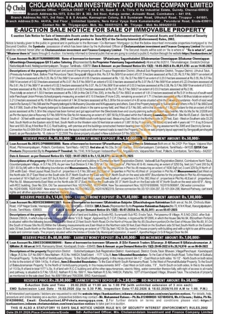 Descriptions of the property:Registration District Gobichettipalayam, Sub Registration District: Kavindapadi, District: Erode, Tauk: Bhavani, Vilage Panchayat: Kavindapad Vilage RS.No. S.F No. 590/11. New Notham: RS.No.1446/24, Total Extent 1177 % Sq. ft. hem-1:Bounded Boundaries- To the East of North South Road, To the West of Sulkadu Perumal Property: To the North of Venkittusamy House, To the South of Murthy property. In this measurement: 64-1/2-East West on both sides 16-1/2 North South on both sides in this to the extent of 1064-1/4 Sq. ft of land, Item-2:Bounded Boundaries: To the East of North South Ramasamy Road, To the West of Perumal Mudalar Property, To the South of Balasubramanisan Property, To the North of Venkittusamy property. In this measurements: 646-East West on both sides, 19 North South on both sides, in this to the extent of 113 Sq.ft of land in total 1177 % Sq. It of land with RCC building and al the other appurtenarices, electric fitting, water connection thereon fully, with night of access to all roads and pathway, is situated in S.F.No. 126 A/2, Natham R.S.No. 590/11, New Natham R.S.No. 1446/24, Patta No. 1077 of Kavindapadi Village, Bhavani Tauk. The schedule of property as mentioned in the sale deed Doct. No.609/1994 and 768/2006, SRO, Kavindapadi