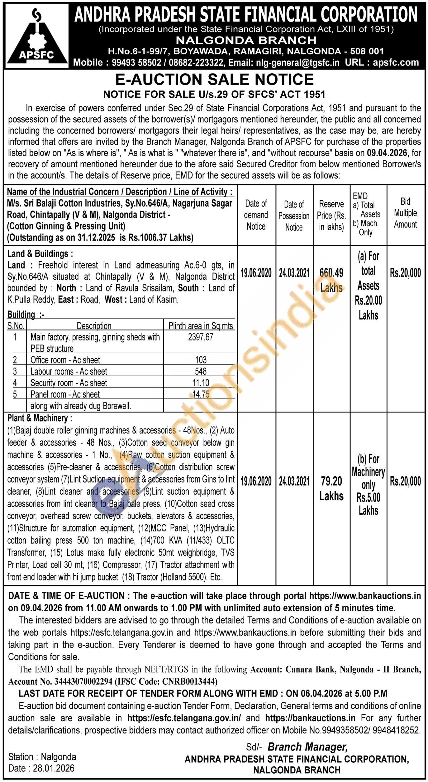 1)Plant & Machinery Bajaj double roller ginning machines & accessories - 48Nos., (2) Auto feeder & accessories 48 Nos., (3) Cotton seed conveyor below gin machine & accessories 1 No., (4) Raw cotton suction equipment & accessories (5) Pre-cleaner & accessories, (6)Cotton distribution screw conveyor system (7) Lint Suction equipment & accessories from Gins to lint cleaner, (8) Lint cleaner and accessories (9) Lint suction equipment & accessories from lint cleaner to Bajaj bale press, (10) Cotton seed cross conveyor, overhead screw conveyor, buckets, elevators & accessories, (11)Structure for automation equipment, (12)MCC Panel, (13)Hydraulic cotton bailing press 500 ton machine, (14)700 KVA (11/433) OLTC Transformer, (15) Lotus make fully electronic 50mt weighbridge, TVS Printer, Load cell 30 mt, (16) Compressor, (17) Tractor attachment with front end loader with hi jump bucket, (18) Tractor (Holland 5500). Etc.,
