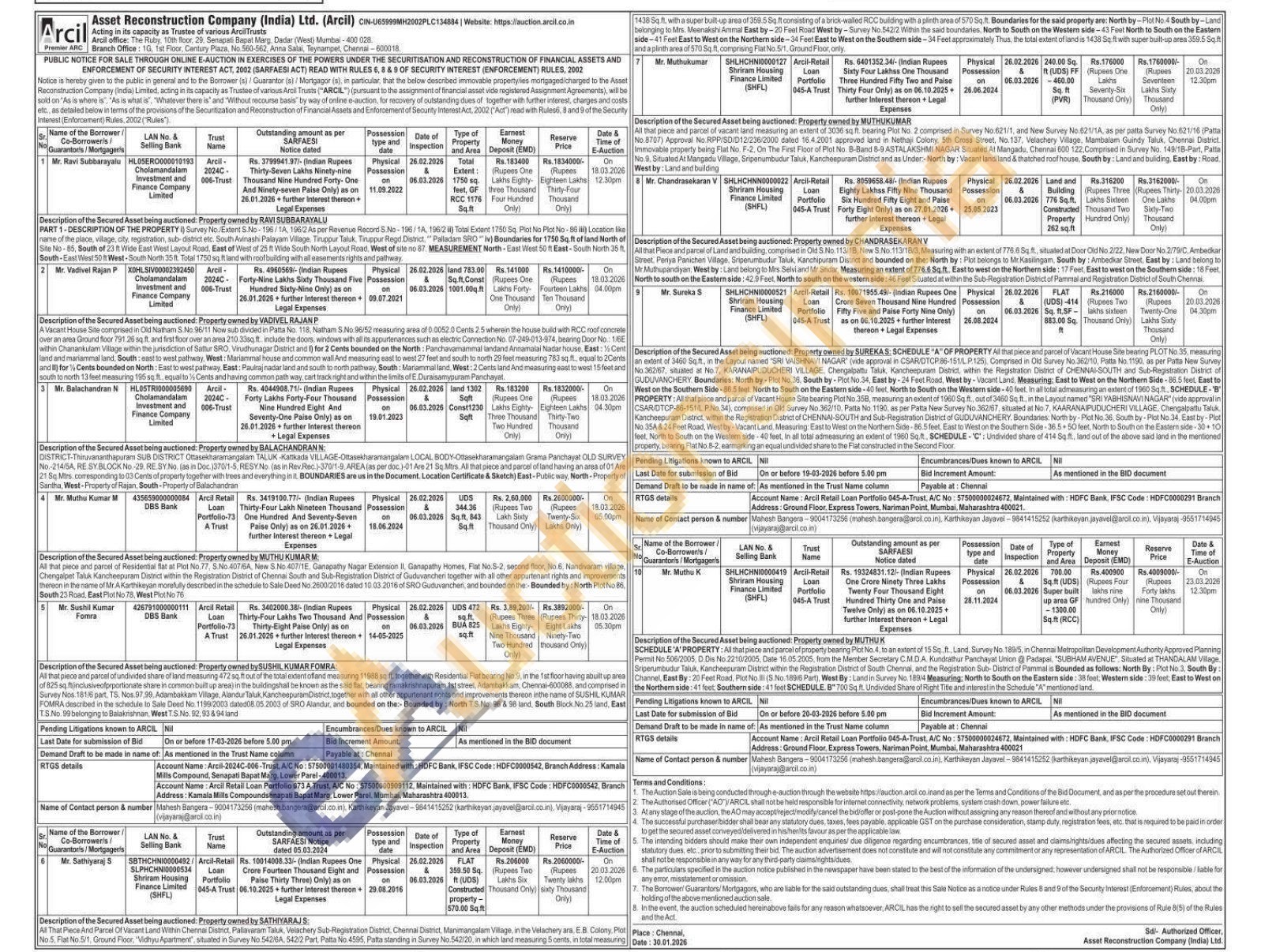 7) All that piece and parcel of vacant land measuring an extent of 3036 sq.ft. bearing Plot No. 2 comprised in Survey No.621/1, and New Survey No.621/1A, as per patta Survey No.621/16 (Patta No 8707) Approval No. RPP/SD/D12/236/2000 dated 16.4.2001 approved land in Nethaji Colony, 5th Cross Street, No. 137, Velachery Village, Mambalam Guindy Taluk, Chennai District Immovable property being Flat No. F-2. On The First Floor of Plot No. B-Band 8-9 ASTALAKSHMI NAGAR Situated At Mangadu, Chennai 600 122.Comprised in Survey No. 149/18-Part, Palta No. 9. Situated At Mangadu Village, Sripenumbudur Taluk, Kancheepuram District and as Under-North by: Vacant land/land & thatched roof house, South by: Land and buliding, East by: Road, West by: Land and building