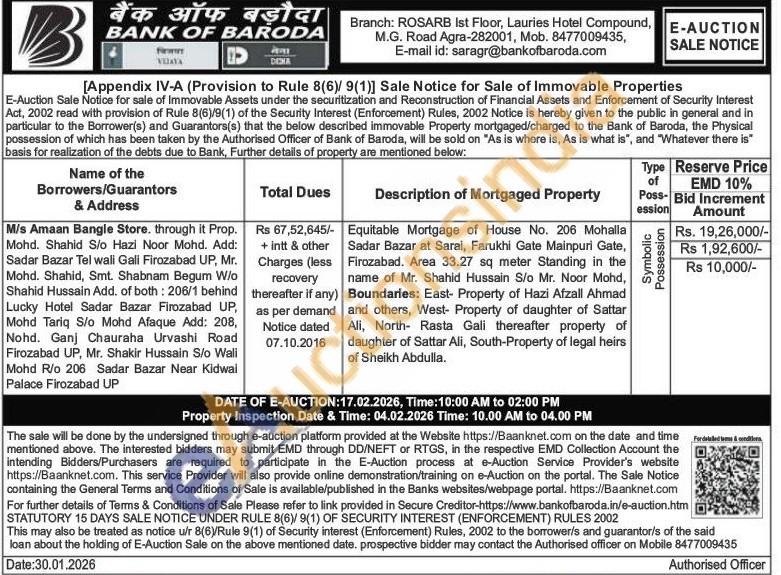 Equitable Mortgage of House No. 206 Mohalla Sadar Bazar at Saral, Farukhi Gate Mainpuri Gate, Firozabad. Area 33.27 sq meter Standing in the name of Mr. Shahid Hussain S/o Mr. Noor Mohd, Boundaries: East- Property of Hazi Afzall Ahmad and others, West- Property of daughter of Sattar Ali, North- Rasta Gali thereafter property of daughter of Sattar Ali, South-Property of legal heirs of Sheikh Abdulla