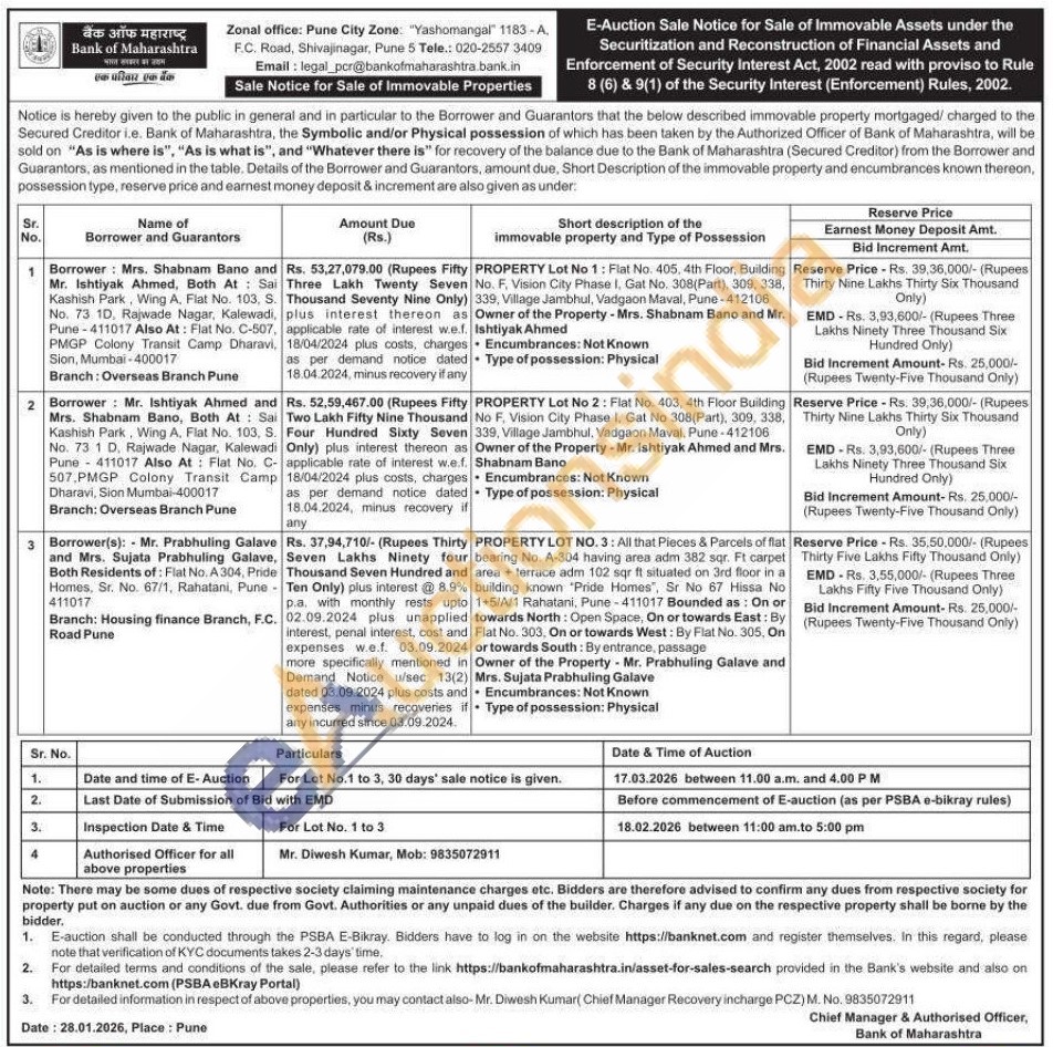 PROPERTY Lot No 1: Flat No. 405, 4th Floor, Building No. F. Vision City Phase I, Gat No. 308(Part), 309, 338, 339, Village Jambhul, Vadgaon Maval, Pune-412106 Owner of the Property - Mrs. Shabnam Bano and Mr. Ishtiyak Ahmed
