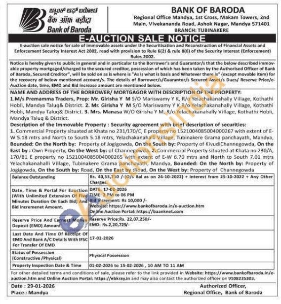 1. Commercial Property situated at Khata no 231/170/C, E property no 1521004085004000267 with extent of E-W 5.18 mtrs and North to South 5.18 mtrs, Yelachakanahalli Village, Tubinakere Grama panchayath, Mandya, Bounded: On the North by: Property of Jogigowda, On the South by: Property of KivudiChannegowda, On the East by: Own Property, On the West by: of Channegowda. 2. Commercial Property situated at Khata no 230/A, 170/B1 E property no 1521004085004000265 with extent of E-W 6.70 mtrs and North to South 7.01 mtrs Yelachakanahalli Village, Tubinakere Grama panchayath, Mandya, Bounded: On the North by: Property of Jogigowda, On the South by: Road, On the East by :Road, On the West by: Property of Channegowda
