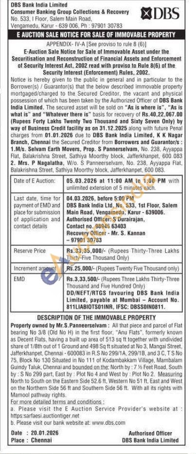 All that piece and parcel of Flat bearing No 3/8 (Old No H) in the first floor, "Anu Flats", formerly known as Decent Flats, having a built up area of 513 sq ft together with undivided share of 1/8th out of 1 Ground and 498 Sq ft situated at No 3, Mangai Street, Jafferkhanpet, Chennai-600083 in R.S No 299/1A, 299/1B, and 3 C. TS No 75, Block No 130 Situated in No 111 of Kodambakkam Village, Mambalam Guindy Taluk, Chennai and bounded on the: North by: 71% Feet Road, South by: S No 299 part, East by: Plot No 4 and West by: Plot No 2. Measuring North to South on the Eastern Side 52.6 ft, Western No 51 ft. East and West on the Northern Side 56 ft and Southern Side 56 ft. With all its rights with Mamool pathway rights.