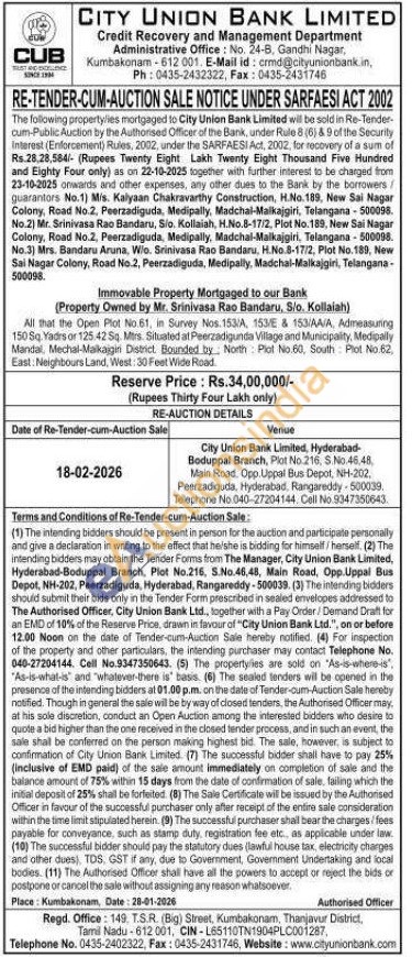Immovable Property Mortgaged to our Bank (Property Owned by Mr. Srinivasa Rao Bandaru, S/o. Kollaiah): All that the Open Plot No.61, in Survey Nos. 153/A, 153/E & 153/AA/A, Admeasuring 150 Sq. Yadrs or 125.42 Sq. Mers. Situated at Peerzadigunda Village and Municipality, Medipally Mandal, Mechal-Malkajgin District. Bounded by North Plot No.60, South Plot No.62, East: Neighbours Land, West: 30 Feet Wide Road