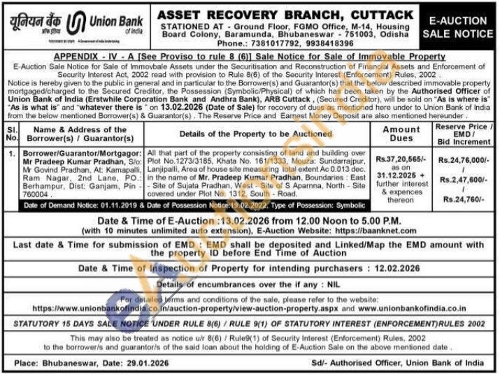 All that part of the property consisting of land and building over Plot No. 1273/3185, Khata No. 161/1333, Mouza: Sundarrajpur, Lanjipalli, Area of house site measuring total extent Ac 0.013 dec. in the name of Mr. Pradeep Kumar Pradhan, Boundaries: East Site of Sujata Pradhan, West Site of S Apanna, North-Site covered under Plot No. 1312. South Road