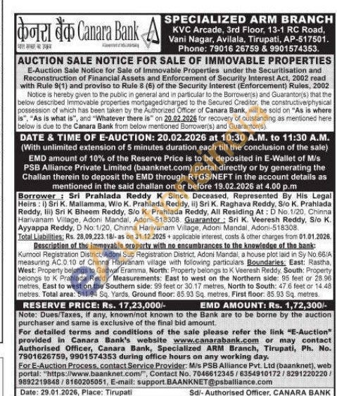 Kurnool Registration District, Adoni Sub Registration District, Adoni Mandal, a house plot laid in Sy No.66/A measuring AC.0.10 of Chinna Harivanam village with following particulars Boundaries: East: Rastha, West: Property belongs to Gadwal Eramma, North: Property belongs to K Veeresh Reddy, South: Property belongs to K Prahlada Reddy Measurements: East to west on the Northern side: 95 feet or 28.96 metres, East to west on the Southern side: 99 feet or 30.17 metres, North to South: 47 6 feet or 14.48 metres. Total area: 511.94 Sq. Yards, Ground floor: 85 93 Sq. metres. First floor: 85.93 Sq. metres